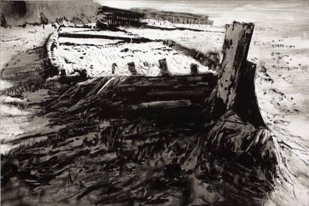 An artist working exclusively on paper, in her drawings and prints there is a tensile loading to her use of materials, where each mark she draws with a brush or a pencil harnesses the forces of natural and man-made worlds. Her graphic gestures are a tactile response of place: the ash of a volcano mingles with ink on the paper or is pitted into the surface of a printing plate.