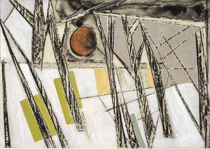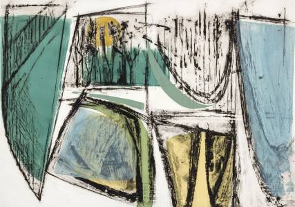 This image combines abstract forms, that have evolved from direct observation of the Savernake Forest in Wiltshire, with stone lithograph drawings done from memory.