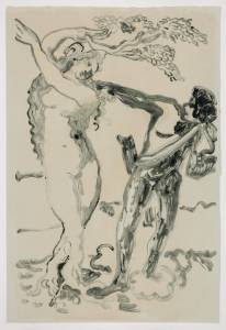 Michaels’ process adds to this unstable mutant world. Beginning with the reversal of the original image. Gestural brushstrokes, slips and smears combined with the sharp boundaries of the cut aluminium plates reveal strange chimeras on the paper. Unsettlingly recognisable yet unfamiliar, they hover between high art and pop culture. Michaels makes multiple versions of each print constantly experimenting and adapting her approach as if engaged in a conversation with the original sitters and the emerging versions of themselves.